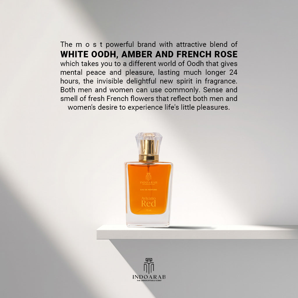 Step into a new world of fragrance with Indoarab Aviyano Red, a powerful unisex perfume built on the pleasure of Oodh. This attractive blend combines precious White Oodh, warm Amber, and romantic French Rose for a scent that provides mental peace and can last over 24 hours. It's an invisible, delightful spirit that captures the desires of both men and women.
